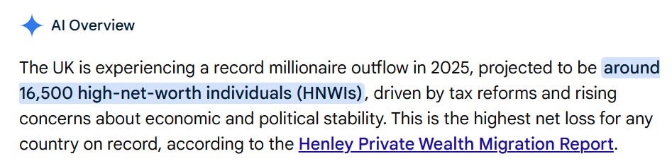 There’s some debate onto how many of these HNWIs are leaving, but purely from people I know in my industry, and myself, one of the reasons I’m considering leaving is due to the massive disincentive and high taxes on businesses in the UK.
