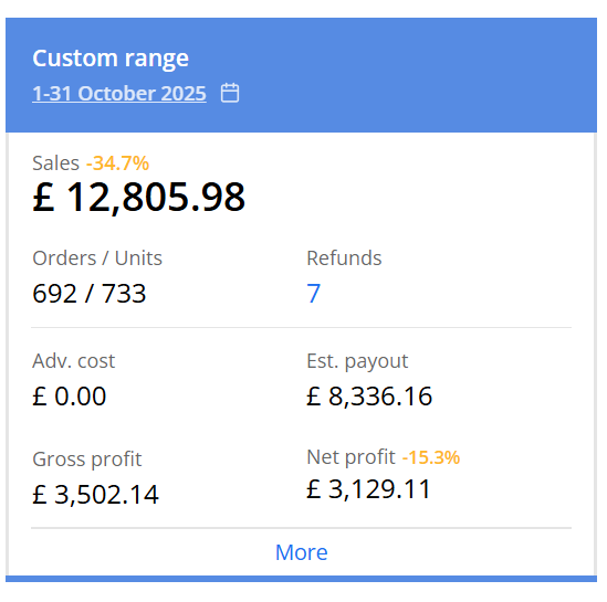 Nov/Dec profits will very likely be similar and my main goal with this is to simply get over the cash flow issues I inherited with this company, get some float in the bank and then potentially push a couple of products before the January rush.