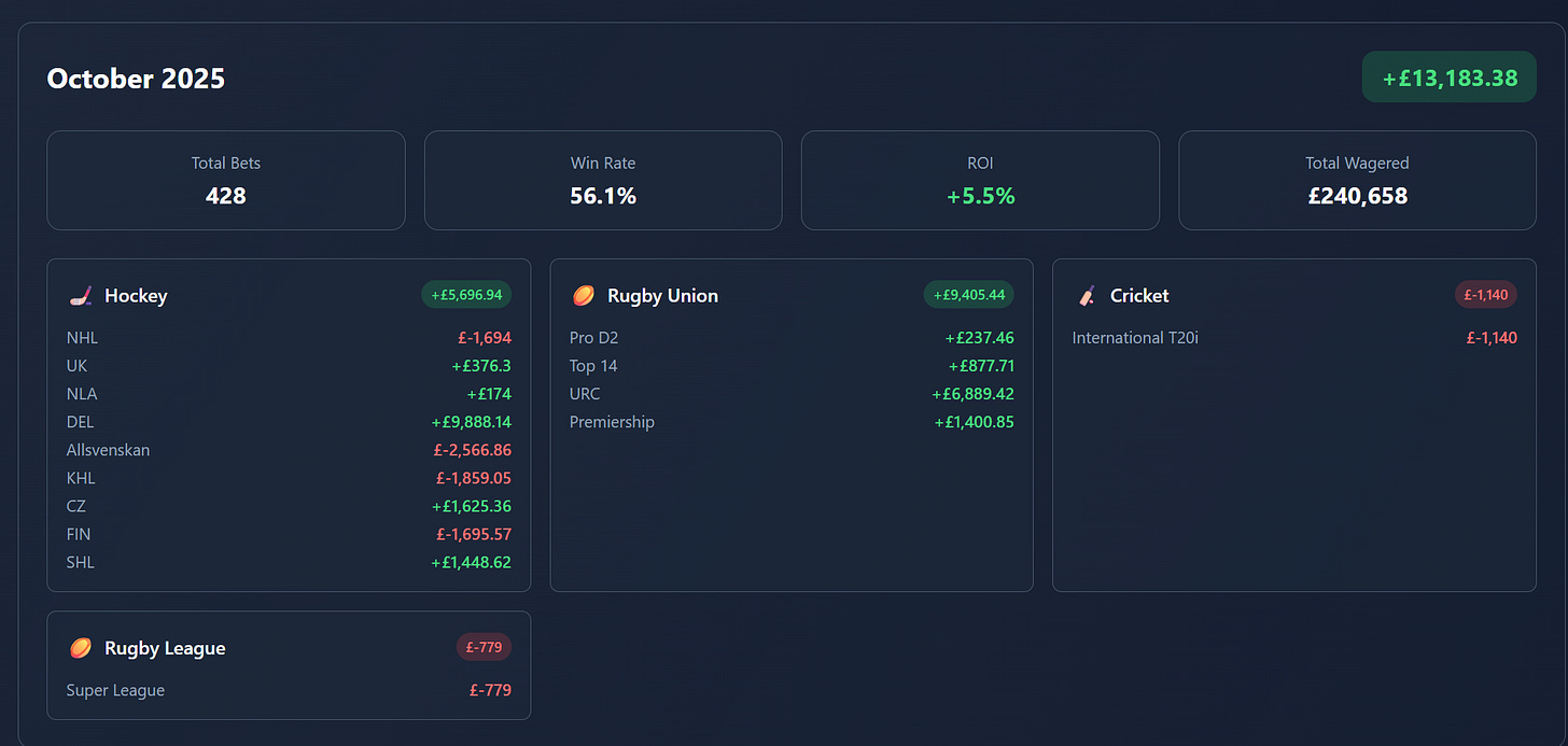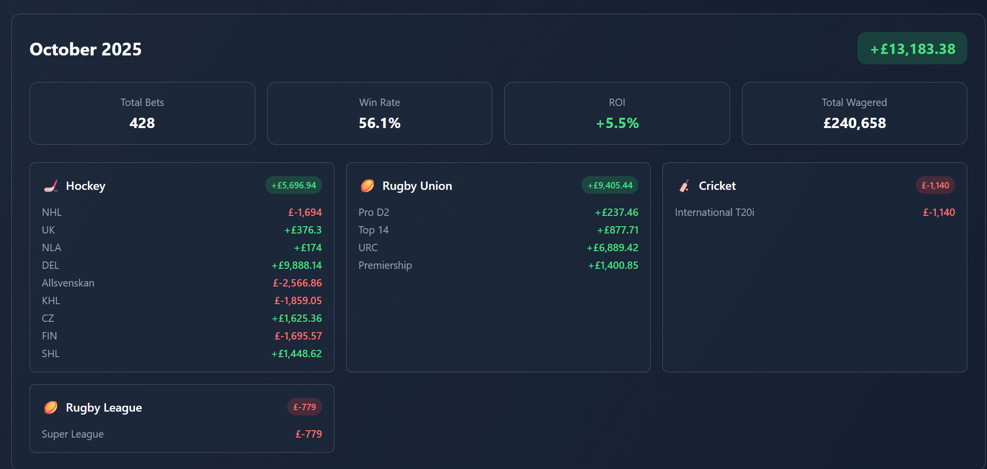 Even “DEL” in hockey had crazy profitability in this time, near £10k on one hockey league in one month is not really sustainable and I expect this to retrace but it’s interesting to see how quick the upside can be with a bit of luck.